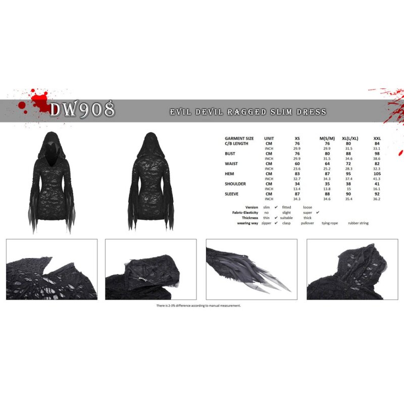 Tajomné a okúzľujúce – gotický top Wraith ti dodá vzhľad temnej čarodejky, ktorá sa vynára z tieňov. Kombinácia roztrhaného efektu, jemných čipkovaných detailov a hlbokej kapucne vytvára dramatický outfit, ktorý dýcha magickou aurou. Dlhé rozšírené rukávy zdôrazňujú pohyb a eleganciu, zatiaľ čo priliehavý strih lichotí postave. Tento kúsok je ako stvorený na gotické večery, festivaly alebo ako silné módne vyjadrenie.