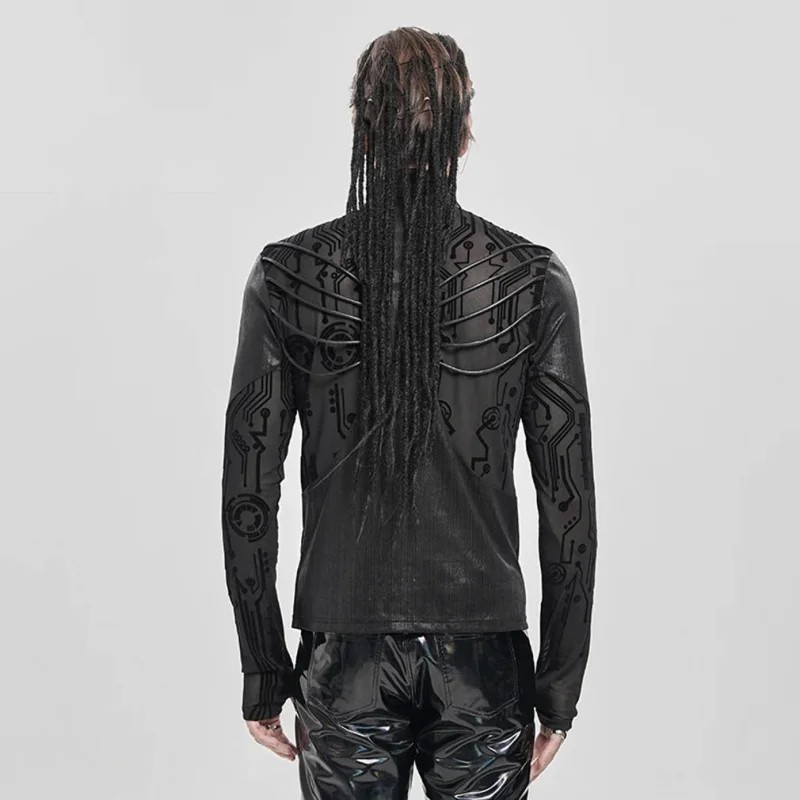 „Circuit“ je stelesnením filozofie Devil Fashion – slobody, temnej estetiky a odmietania obyčajného života. Toto tričko s dlhým rukávom pôsobí, akoby prišlo priamo z dystopickej budúcnosti, kde sa človek prepája so strojom a identita sa nosí bez kompromisov. Polopriesvitná sieťovina s futuristickým motívom elektronických obvodov vytvára efekt druhej kože – technický, chladný a zároveň provokatívny.